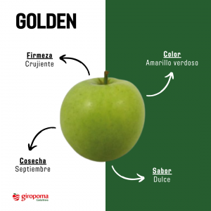 La Golden es una manzana de piel suave y color amarillo verdoso con una ligera tonalidad dorada, de forma redonda y calibre medio – grande. Su textura es crujiente, jugosa y lisa, y presenta una pulpa blanca y consistente. Se caracteriza por un alto contenido en azúcares y bajo contenido en ácidos, y es muy aromática. Su momento óptimo de cosecha es a principios de septiembre, y se puede encontrar durante todo el año, puesto que destaca por su buena conservación.